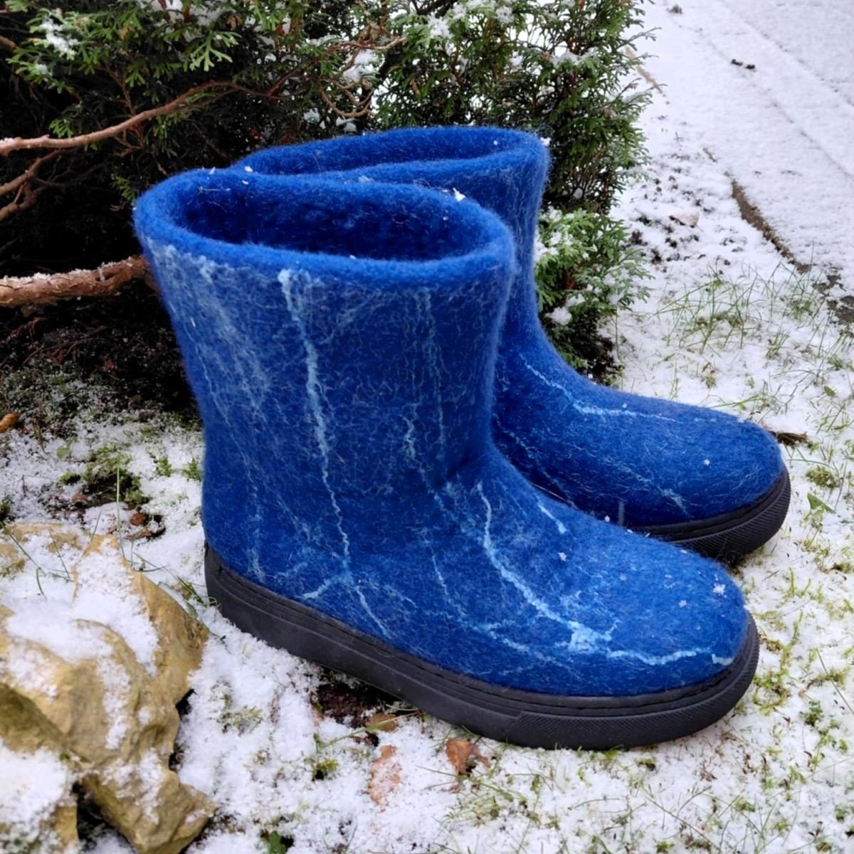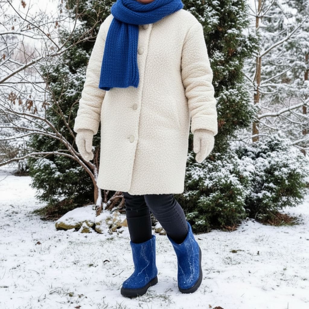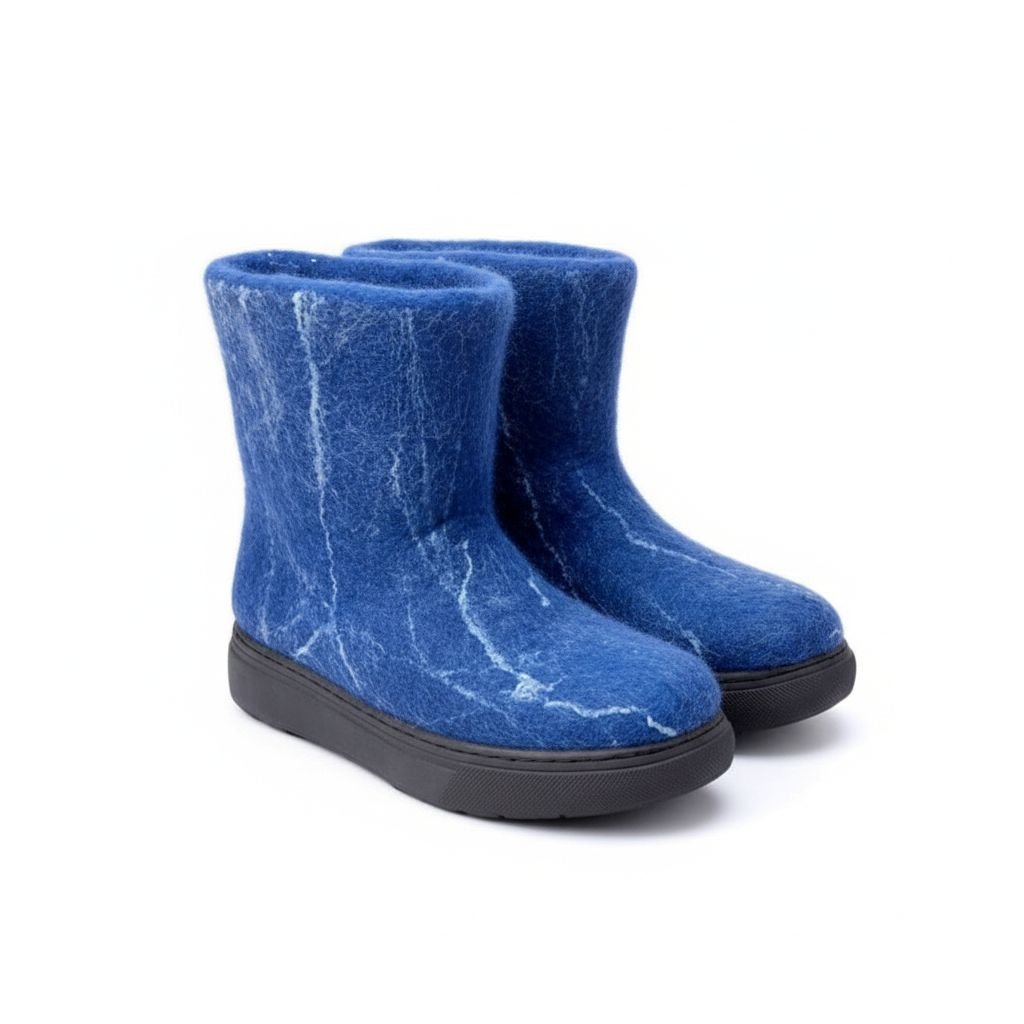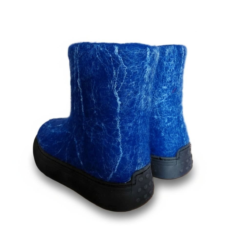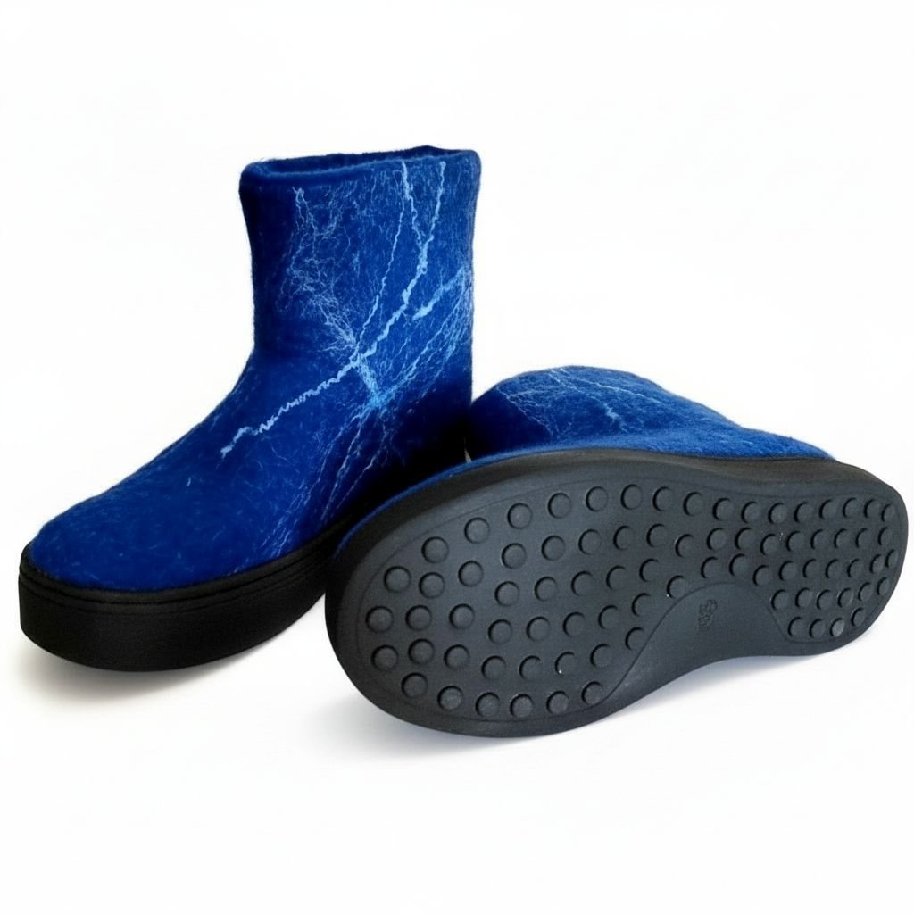 Mėlyni veltiniai batai – tai aukštos kokybės rankų darbo moteriška avalynė, pagaminta iš natūralios avies vilnos. Šie batai sukurti taip, kad užtikrintų maksimalų šilumos ir komforto pojūtį net ir pačiomis atšiauriausiomis oro sąlygomis. Natūrali avies vilna nuo seno vertinama dėl savo termoreguliacinių savybių: ji geba išlaikyti šilumą, kartu leisdama pėdai kvėpuoti ir išlikti sausai. Tai avalynė, kuri puikiai tinka tiek žiemos speigui, tiek vėsoms rudens dienoms.